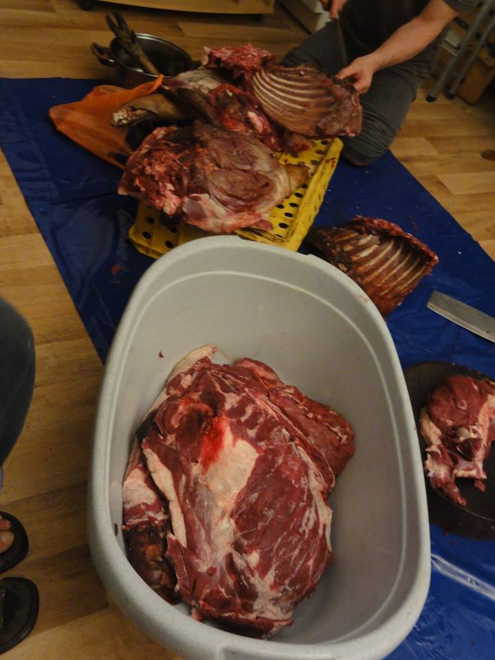 Das blutgetränkte Fleisch wird in verschiedenste Körbe gelegt und dort in abgewogene Päckchen abgepackt. So kann die Ware schnell zum Verbraucher gebracht werden.